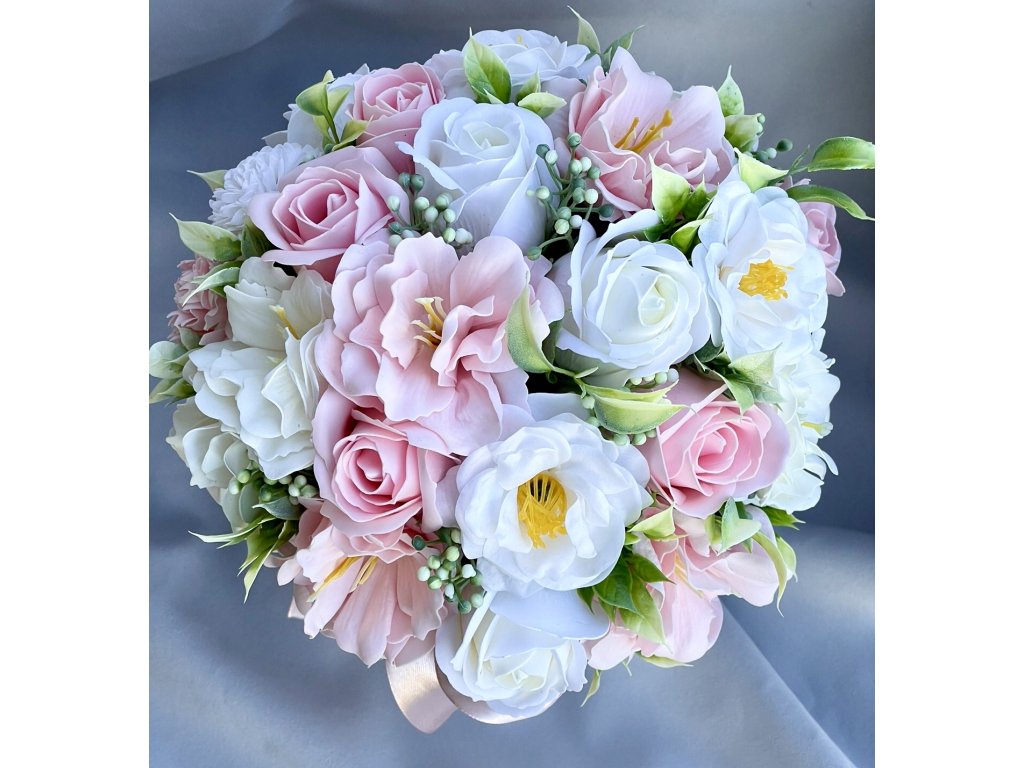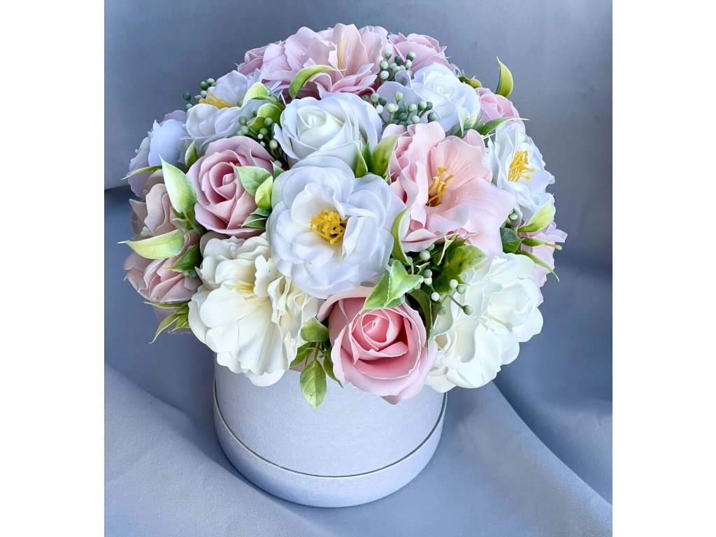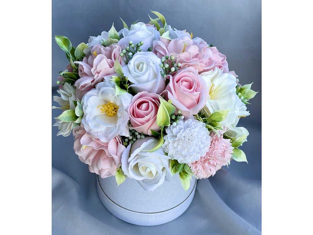 Keďže ide o ručne vyrábané kytice, výrobca si vyhradzuje právo na zmenu v detailoch (odtieň boxu, zeleň, doplnky) podľa dostupnosti materiálu. Celkový štýl kytice zostane zachovaný.